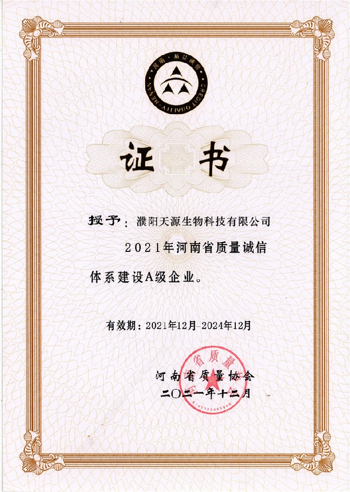 河南省質(zhì)量誠信體系建設(shè)A級企業(yè)